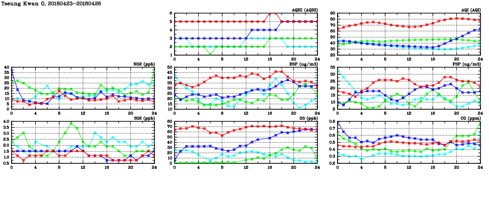 | Air Quality Data Time Series in Tseung Kwan O (2018/04/26) | ( Line colors: Day -3 Day -2 Day -1 Current day ) | 2D Map Current AQHI |