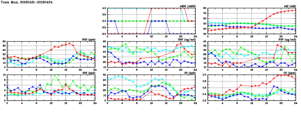 | Air Quality Data Time Series in Tuen Mun (2018/04/24) | ( Line colors: Day -3 Day -2 Day -1 Current day ) | 2D Map Current AQHI |