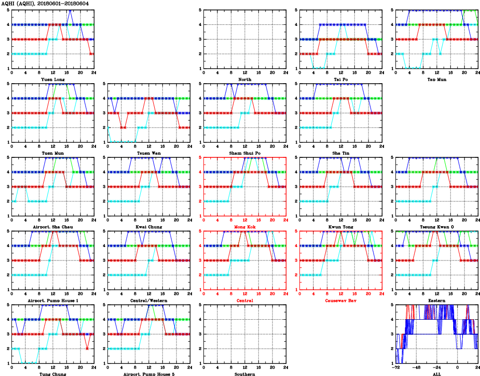 | Air Quality Data Time Series for AQHI (2018/06/04) | ( Line colors: Day -3 Day -2 Day -1 Current day ) | 2D Map Current AQHI |