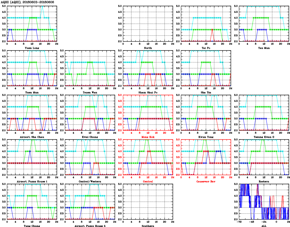 | Air Quality Data Time Series for AQHI (2018/06/06) | ( Line colors: Day -3 Day -2 Day -1 Current day ) | 2D Map Current AQHI |
