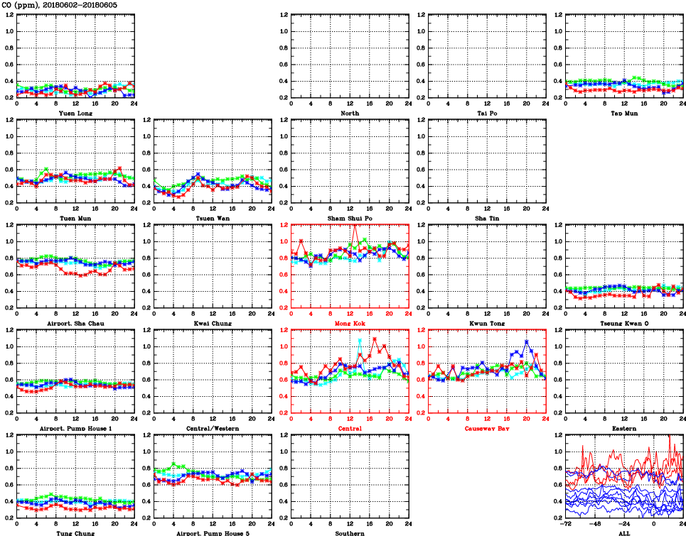 | Air Quality Data Time Series for CO (2018/06/05) | ( Line colors: Day -3 Day -2 Day -1 Current day ) | 2D Map Current AQHI |