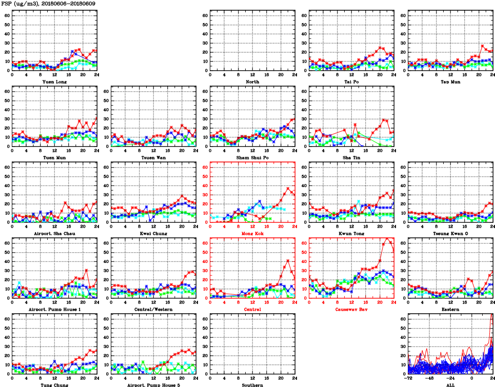 | Air Quality Data Time Series for FSP (2018/06/09) | ( Line colors: Day -3 Day -2 Day -1 Current day ) | 2D Map Current AQHI |