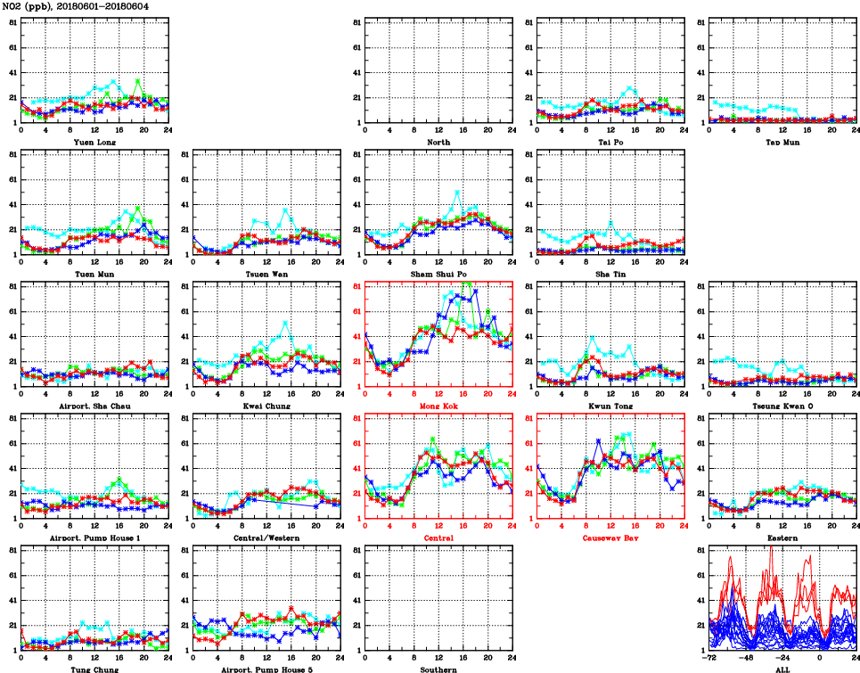 | Air Quality Data Time Series for NO2 (2018/06/04) | ( Line colors: Day -3 Day -2 Day -1 Current day ) | 2D Map Current AQHI |