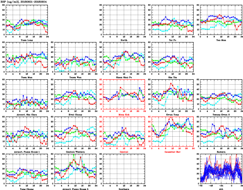 | Air Quality Data Time Series for RSP (2018/06/04) | ( Line colors: Day -3 Day -2 Day -1 Current day ) | 2D Map Current AQHI |
