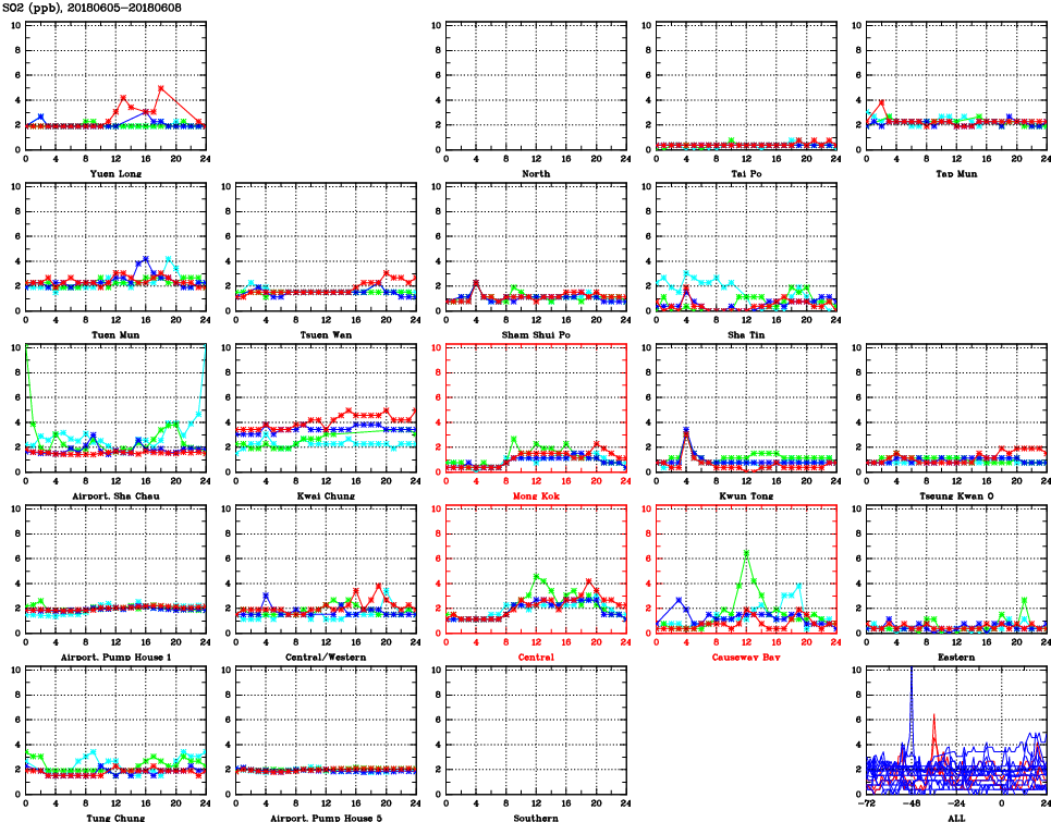 | Air Quality Data Time Series for SO2 (2018/06/08) | ( Line colors: Day -3 Day -2 Day -1 Current day ) | 2D Map Current AQHI |
