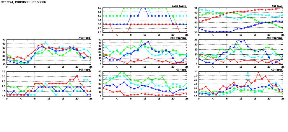 | Air Quality Data Time Series in Central (2018/06/05) | ( Line colors: Day -3 Day -2 Day -1 Current day ) | 2D Map Current AQHI |