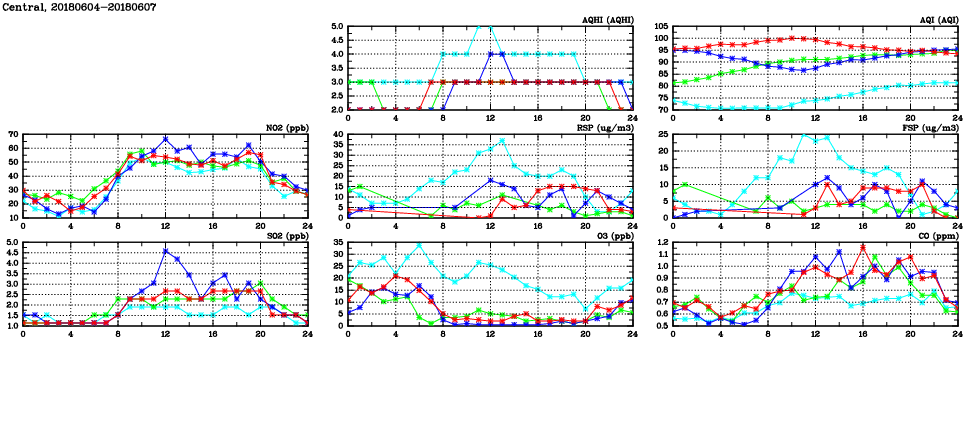 | Air Quality Data Time Series in Central (2018/06/07) | ( Line colors: Day -3 Day -2 Day -1 Current day ) | 2D Map Current AQHI |