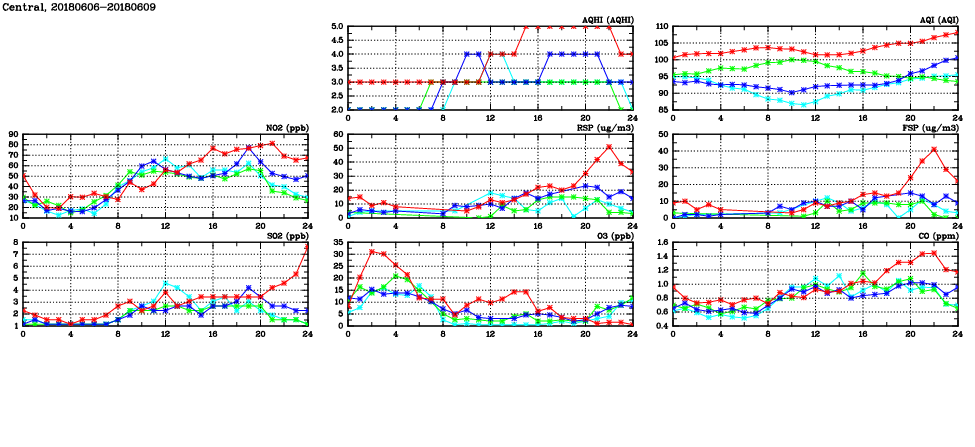 | Air Quality Data Time Series in Central (2018/06/09) | ( Line colors: Day -3 Day -2 Day -1 Current day ) | 2D Map Current AQHI |