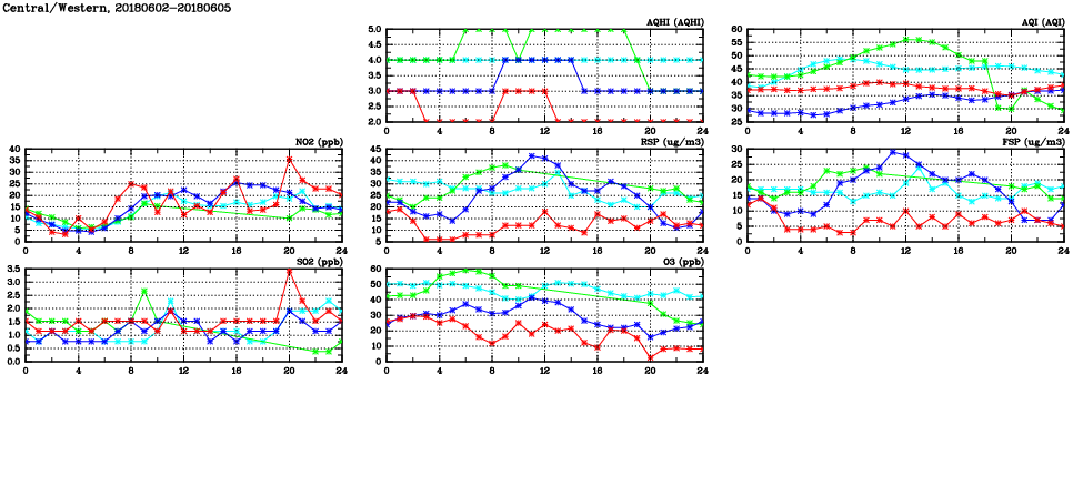 | Air Quality Data Time Series in Central/Western (2018/06/05) | ( Line colors: Day -3 Day -2 Day -1 Current day ) | 2D Map Current AQHI |