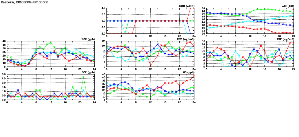 | Air Quality Data Time Series in Eastern (2018/06/08) | ( Line colors: Day -3 Day -2 Day -1 Current day ) | 2D Map Current AQHI |