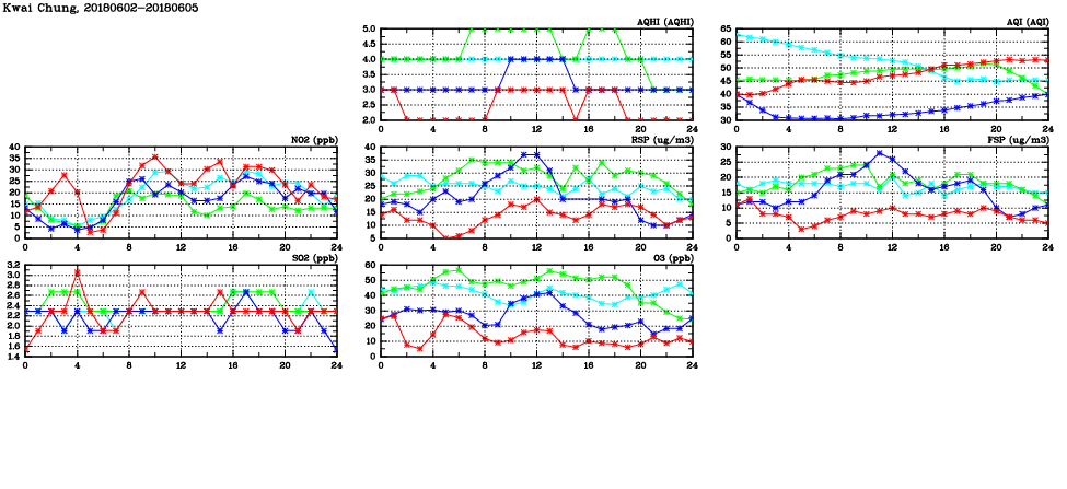 | Air Quality Data Time Series in Kwai Chung (2018/06/05) | ( Line colors: Day -3 Day -2 Day -1 Current day ) | 2D Map Current AQHI |