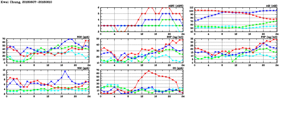 | Air Quality Data Time Series in Kwai Chung (2018/06/10) | ( Line colors: Day -3 Day -2 Day -1 Current day ) | 2D Map Current AQHI |