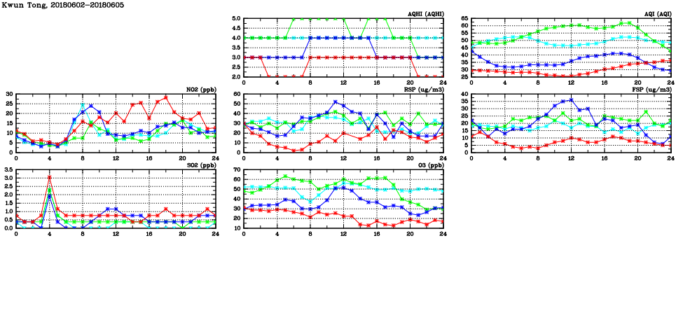 | Air Quality Data Time Series in Kwun Tong (2018/06/05) | ( Line colors: Day -3 Day -2 Day -1 Current day ) | 2D Map Current AQHI |