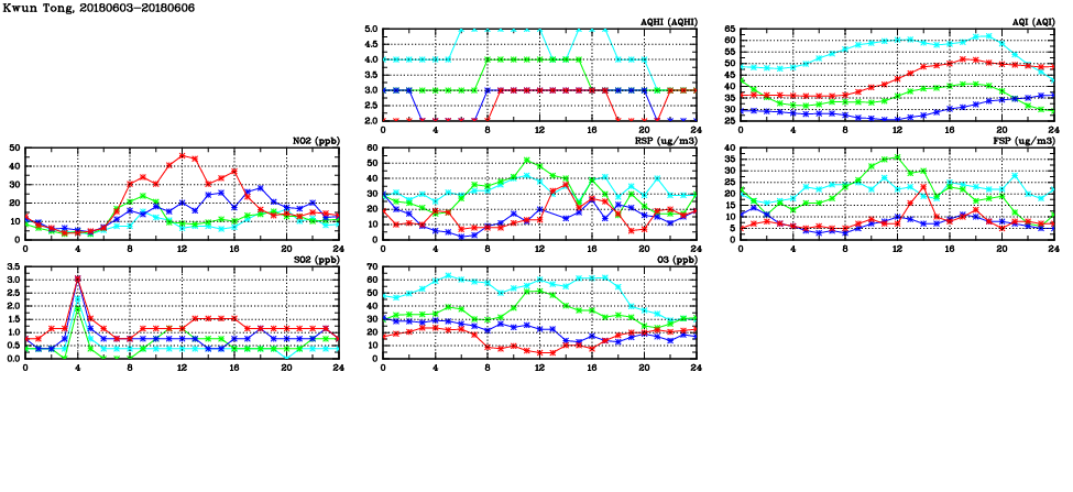 | Air Quality Data Time Series in Kwun Tong (2018/06/06) | ( Line colors: Day -3 Day -2 Day -1 Current day ) | 2D Map Current AQHI |