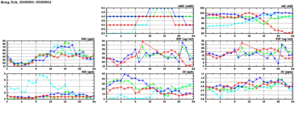 | Air Quality Data Time Series in Mong Kok (2018/06/04) | ( Line colors: Day -3 Day -2 Day -1 Current day ) | 2D Map Current AQHI |