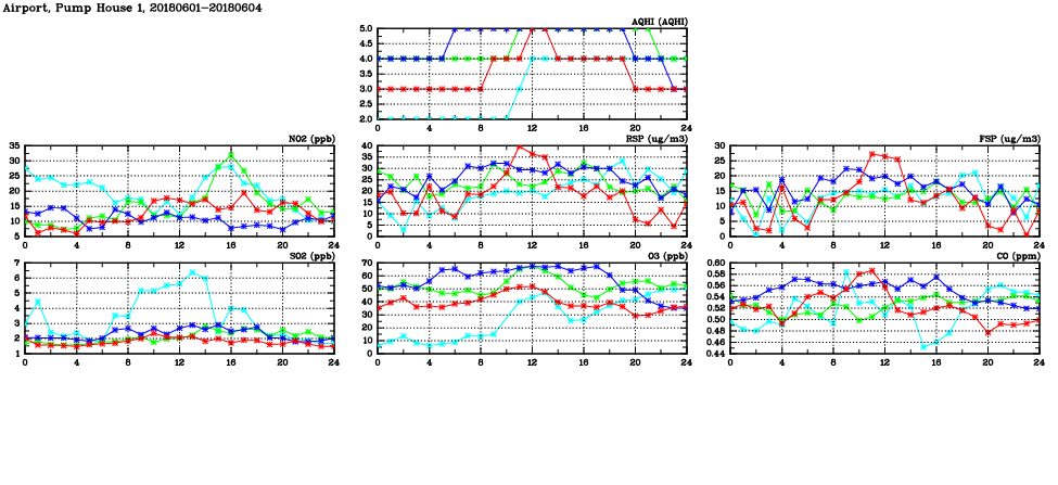 | Air Quality Data Time Series in Airport, Pump House 1 (2018/06/04) | ( Line colors: Day -3 Day -2 Day -1 Current day ) | 2D Map Current AQHI |
