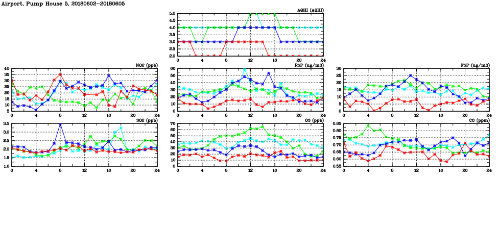 | Air Quality Data Time Series in Airport, Pump House 5 (2018/06/05) | ( Line colors: Day -3 Day -2 Day -1 Current day ) | 2D Map Current AQHI |