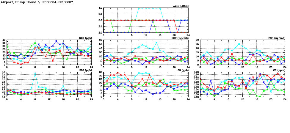 | Air Quality Data Time Series in Airport, Pump House 5 (2018/06/07) | ( Line colors: Day -3 Day -2 Day -1 Current day ) | 2D Map Current AQHI |
