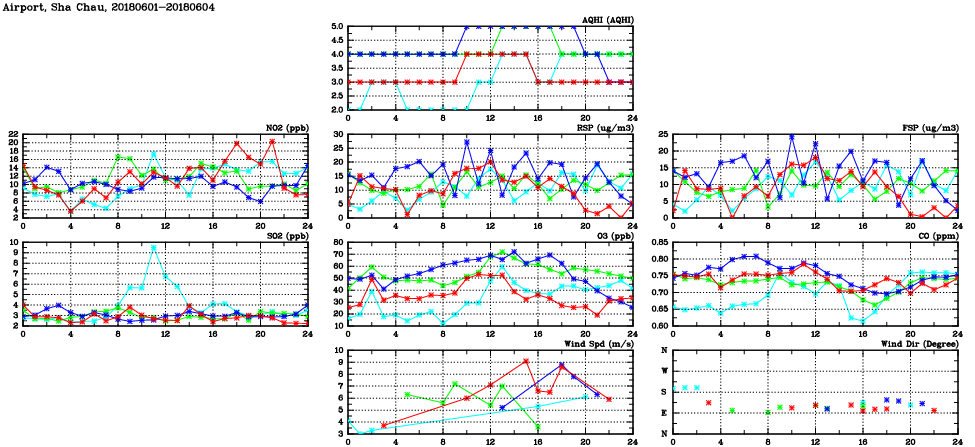 | Air Quality Data Time Series in Airport, Sha Chau (2018/06/04) | ( Line colors: Day -3 Day -2 Day -1 Current day ) | 2D Map Current AQHI |
