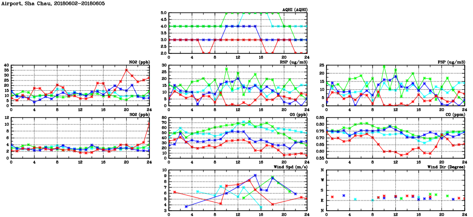 | Air Quality Data Time Series in Airport, Sha Chau (2018/06/05) | ( Line colors: Day -3 Day -2 Day -1 Current day ) | 2D Map Current AQHI |