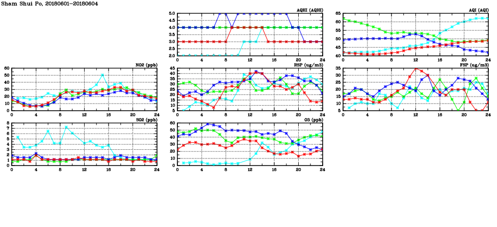 | Air Quality Data Time Series in Sham Shui Po (2018/06/04) | ( Line colors: Day -3 Day -2 Day -1 Current day ) | 2D Map Current AQHI |
