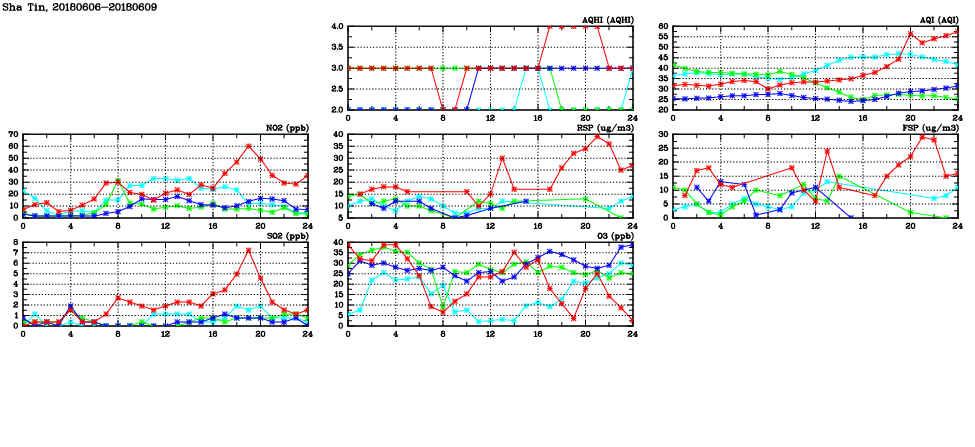 | Air Quality Data Time Series in Sha Tin (2018/06/09) | ( Line colors: Day -3 Day -2 Day -1 Current day ) | 2D Map Current AQHI |