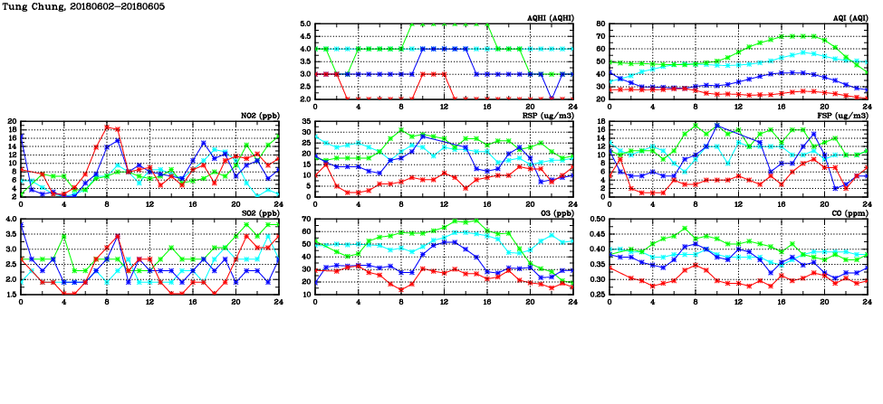 | Air Quality Data Time Series in Tung Chung (2018/06/05) | ( Line colors: Day -3 Day -2 Day -1 Current day ) | 2D Map Current AQHI |