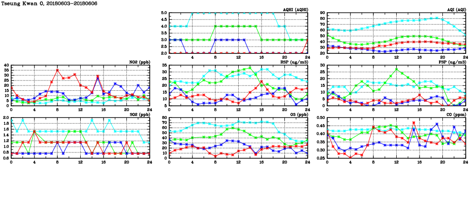 | Air Quality Data Time Series in Tseung Kwan O (2018/06/06) | ( Line colors: Day -3 Day -2 Day -1 Current day ) | 2D Map Current AQHI |