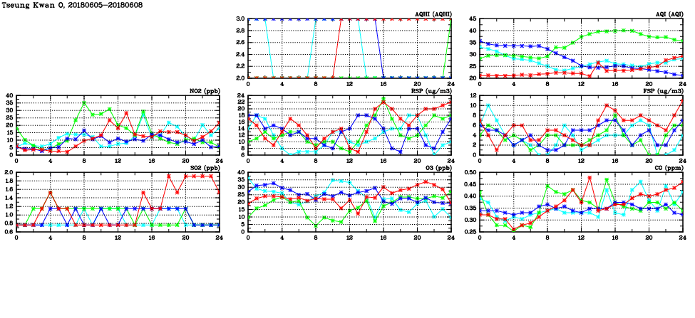 | Air Quality Data Time Series in Tseung Kwan O (2018/06/08) | ( Line colors: Day -3 Day -2 Day -1 Current day ) | 2D Map Current AQHI |
