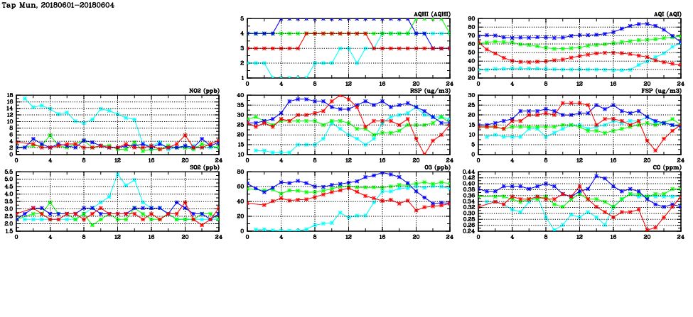 | Air Quality Data Time Series in Tap Mun (2018/06/04) | ( Line colors: Day -3 Day -2 Day -1 Current day ) | 2D Map Current AQHI |