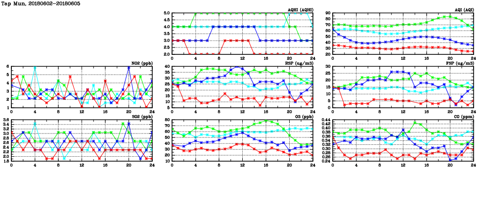 | Air Quality Data Time Series in Tap Mun (2018/06/05) | ( Line colors: Day -3 Day -2 Day -1 Current day ) | 2D Map Current AQHI |
