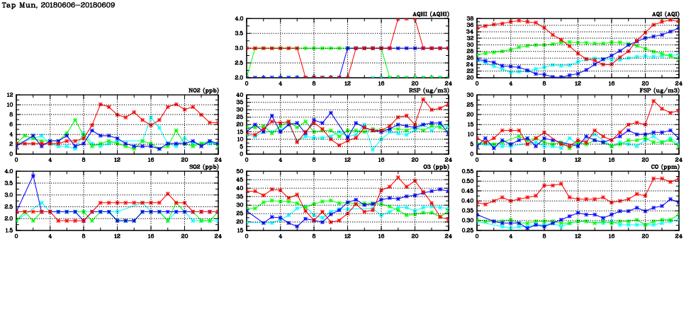| Air Quality Data Time Series in Tap Mun (2018/06/09) | ( Line colors: Day -3 Day -2 Day -1 Current day ) | 2D Map Current AQHI |