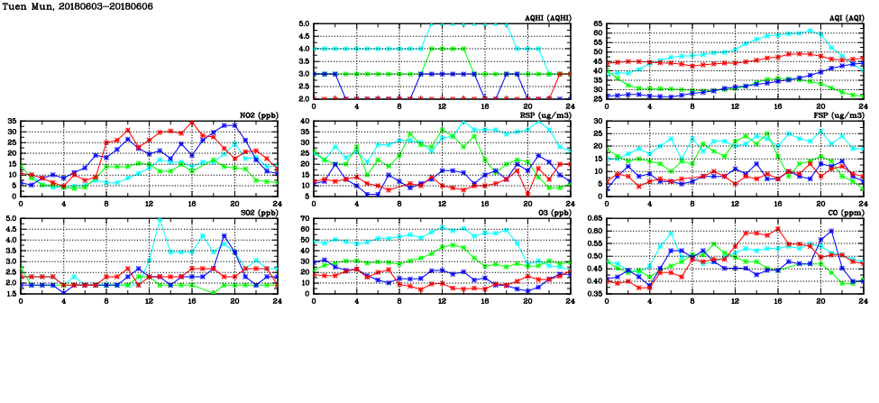 | Air Quality Data Time Series in Tuen Mun (2018/06/06) | ( Line colors: Day -3 Day -2 Day -1 Current day ) | 2D Map Current AQHI |
