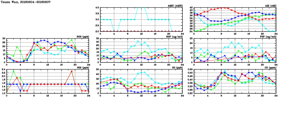 | Air Quality Data Time Series in Tsuen Wan (2018/06/07) | ( Line colors: Day -3 Day -2 Day -1 Current day ) | 2D Map Current AQHI |