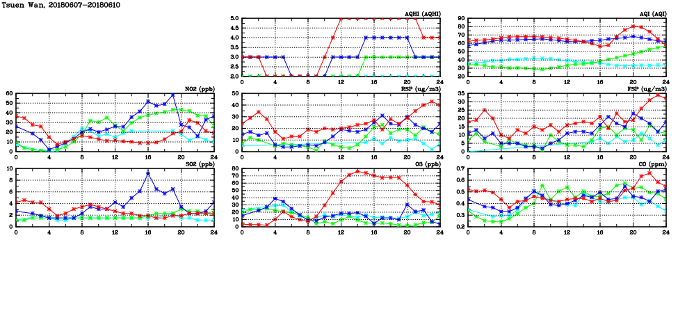 | Air Quality Data Time Series in Tsuen Wan (2018/06/10) | ( Line colors: Day -3 Day -2 Day -1 Current day ) | 2D Map Current AQHI |