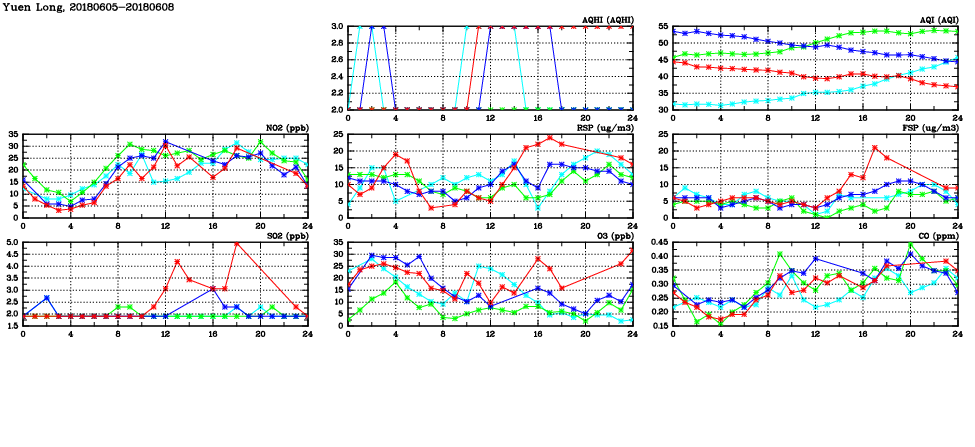 | Air Quality Data Time Series in Yuen Long (2018/06/08) | ( Line colors: Day -3 Day -2 Day -1 Current day ) | 2D Map Current AQHI |