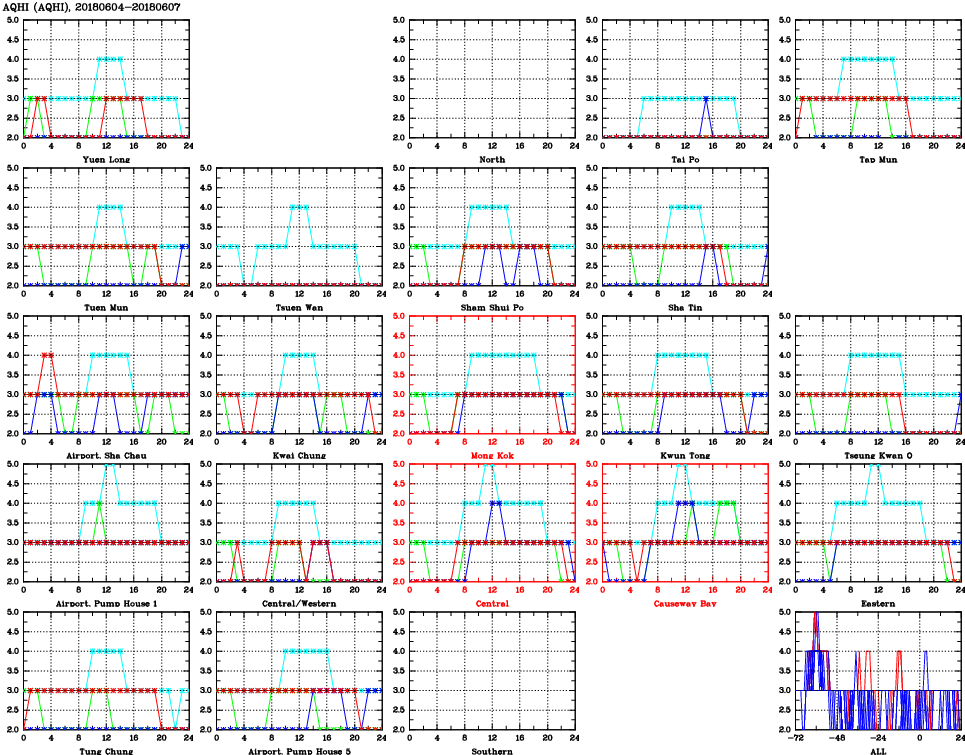 | Air Quality Data Time Series for AQHI (2018/06/07) | ( Line colors: Day -3 Day -2 Day -1 Current day ) | 2D Map Current AQHI |