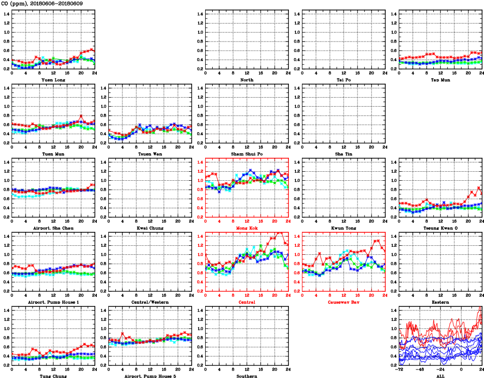 | Air Quality Data Time Series for CO (2018/06/09) | ( Line colors: Day -3 Day -2 Day -1 Current day ) | 2D Map Current AQHI |