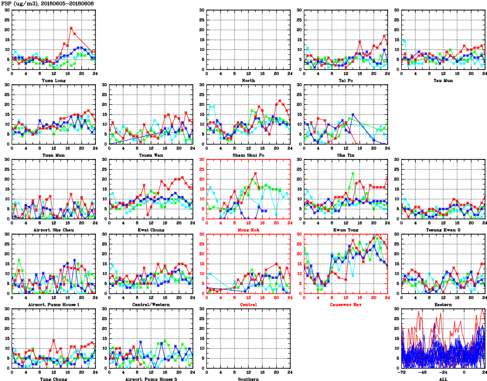 | Air Quality Data Time Series for FSP (2018/06/08) | ( Line colors: Day -3 Day -2 Day -1 Current day ) | 2D Map Current AQHI |
