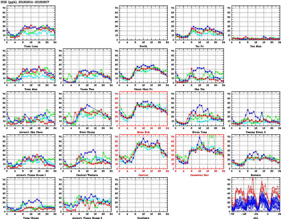 | Air Quality Data Time Series for NO2 (2018/06/07) | ( Line colors: Day -3 Day -2 Day -1 Current day ) | 2D Map Current AQHI |