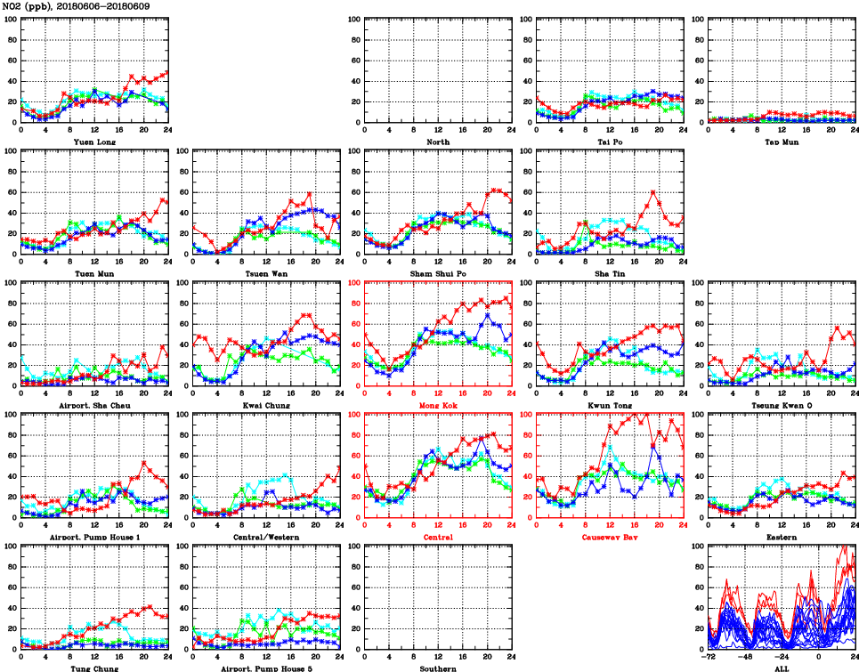 | Air Quality Data Time Series for NO2 (2018/06/09) | ( Line colors: Day -3 Day -2 Day -1 Current day ) | 2D Map Current AQHI |