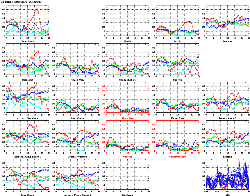 | Air Quality Data Time Series for O3 (2018/06/09) | ( Line colors: Day -3 Day -2 Day -1 Current day ) | 2D Map Current AQHI |
