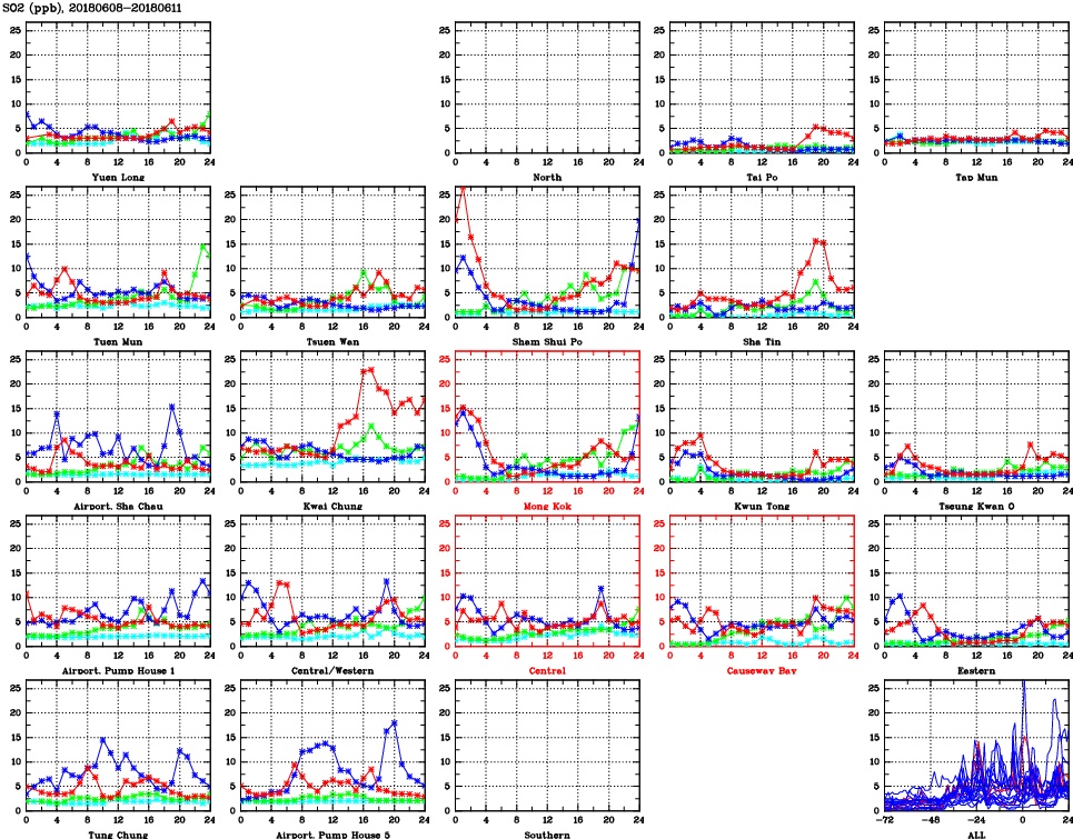 | Air Quality Data Time Series for SO2 (2018/06/11) | ( Line colors: Day -3 Day -2 Day -1 Current day ) | 2D Map Current AQHI |