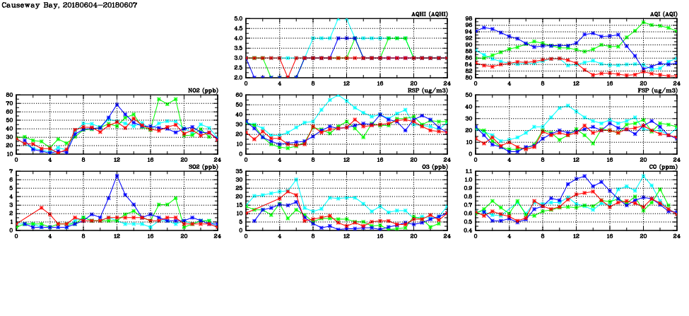 | Air Quality Data Time Series in Causeway Bay (2018/06/07) | ( Line colors: Day -3 Day -2 Day -1 Current day ) | 2D Map Current AQHI |