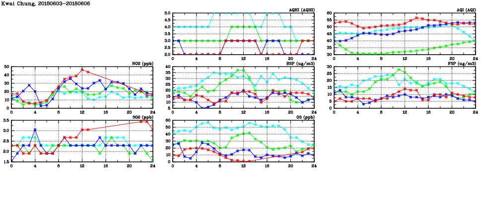 | Air Quality Data Time Series in Kwai Chung (2018/06/06) | ( Line colors: Day -3 Day -2 Day -1 Current day ) | 2D Map Current AQHI |