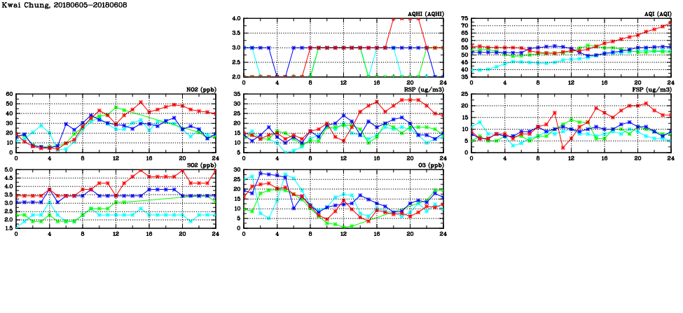 | Air Quality Data Time Series in Kwai Chung (2018/06/08) | ( Line colors: Day -3 Day -2 Day -1 Current day ) | 2D Map Current AQHI |