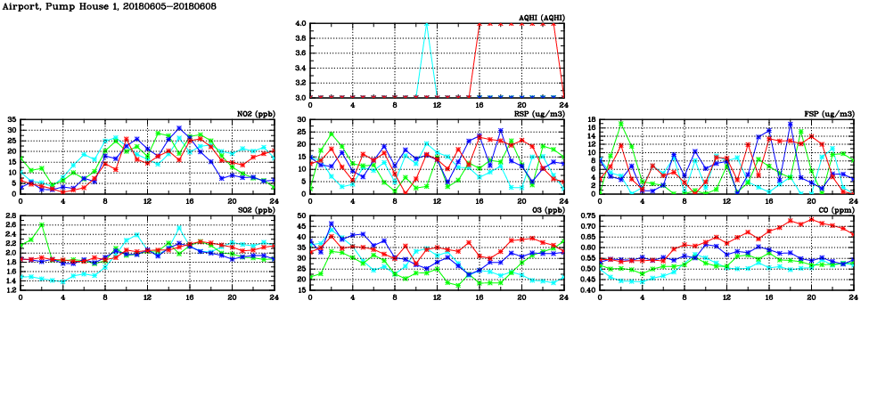 | Air Quality Data Time Series in Airport, Pump House 1 (2018/06/08) | ( Line colors: Day -3 Day -2 Day -1 Current day ) | 2D Map Current AQHI |