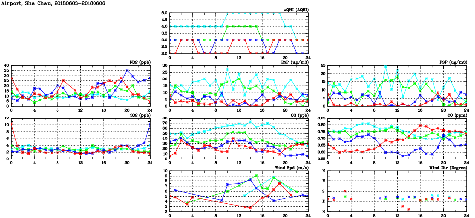 | Air Quality Data Time Series in Airport, Sha Chau (2018/06/06) | ( Line colors: Day -3 Day -2 Day -1 Current day ) | 2D Map Current AQHI |