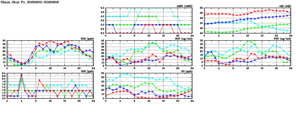 | Air Quality Data Time Series in Sham Shui Po (2018/06/06) | ( Line colors: Day -3 Day -2 Day -1 Current day ) | 2D Map Current AQHI |