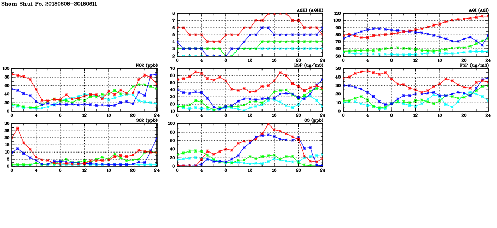 | Air Quality Data Time Series in Sham Shui Po (2018/06/11) | ( Line colors: Day -3 Day -2 Day -1 Current day ) | 2D Map Current AQHI |